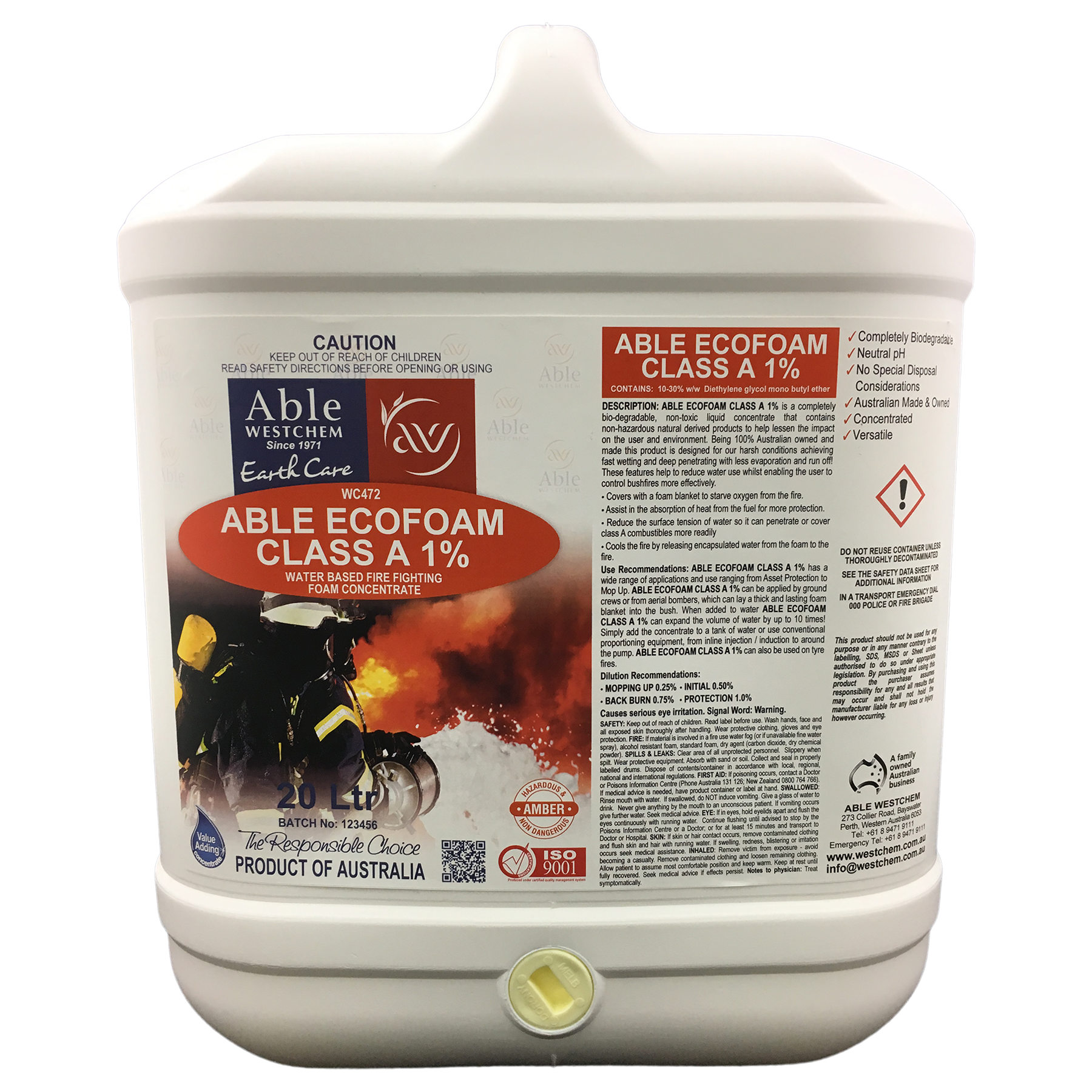 ABLE ECOFOAM CLASS A 1% is completely bio-degradable, non-toxic liquid concentrate that contains nonhazardous natural derived products to help lessen the impact on the user and environment. Being 100% Australian owned and made this product is designed for our harsh conditions achieving fast wetting and deep penetrating with less evaporation and run offs.